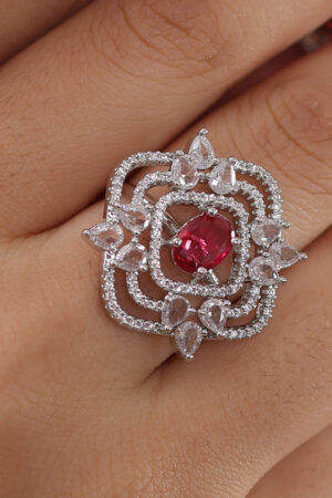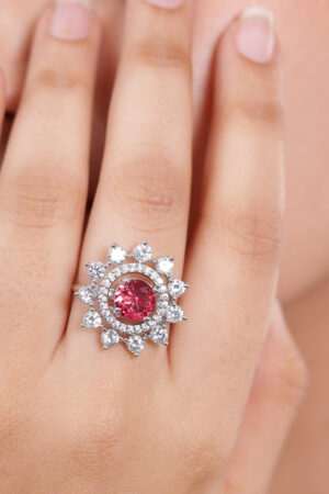 Surrounded by delicate petal-shaped white stones arranged in layered floral patterns